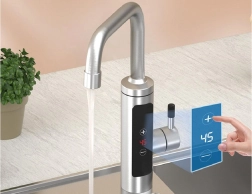 Elektryczny przepływowy podgrzewacz wody wbudowany bezpośrednio w baterię kuchenną oferuje wygodę, oszczędność miejsca i natychmiastowe podgrzewanie. Dzięki mocy 3000 W uzyskasz ciepłą wodę w kilka sekund, bez oczekiwania i bez potrzeby centralnego ogrzewania. Zintegrowany wyświetlacz LCD czytelnie pokazuje temperaturę, dając pełną kontrolę nad komfortem i bezpieczeństwem.