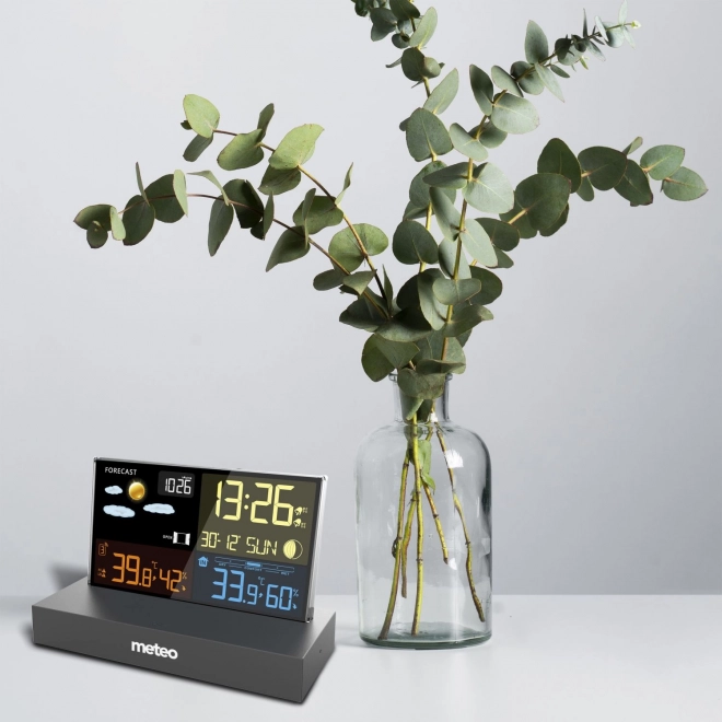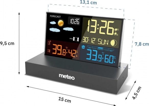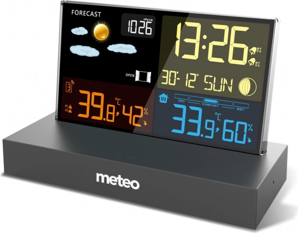 Stacja pogodowa METEO SP110C oferuje kompleksowy przegląd pogody i klimatu domowego. Bezprzewodowy czujnik przesyła dane o temperaturze i wilgotności na odległość do 60 m, a kolorowy wyświetlacz z czytelnymi ikonami pokazuje prognozę na 12–24 godziny, fazy Księżyca oraz trend ciśnienia z wbudowanego barometru. Dzięki zegarowi sterowanemu radiowo DCF zawsze masz dokładny czas, a budzik z funkcją snooze umili każde poranne wstawanie.