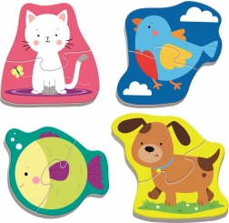 Odkryj pierwsze układanki dla maluchów – 4 urocze puzzle w kształcie zwierząt domowych. Każdy obrazek składa się z 2 dużych elementów, dzięki czemu dzieci szybko osiągają sukces i z radością układają ponownie. Nasycone kolory i przyjazne ilustracje naturalnie zachęcają do zabawy.