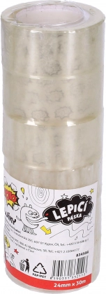 Zestaw przezroczystych taśm klejących o szerokości 24 mm i nawoju 30 m, idealny do codziennego użytku w biurze lub w domu. Każde opakowanie zawiera 6 sztuk taśmy.