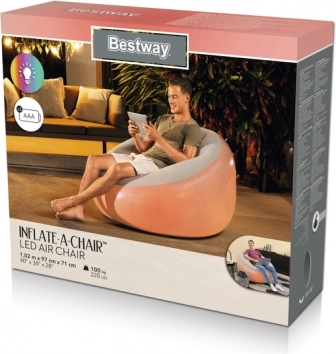 Nadmuchiwany fotel BESTWAY o wymiarach 102 × 97 × 71 cm to praktyczne rozwiązanie do domu, akademika i na taras. Dzięki zintegrowanemu podświetleniu LED (7 kolorów) tworzy przyjemną atmosferę podczas oglądania filmów, wieczorów z grami lub odpoczynku po pracy. Po spuszczeniu powietrza zajmuje minimum miejsca i łatwo go przenosić.