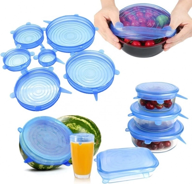 Sześć pokrywek o różnych średnicach pasuje do słoików, misek, garnków i przekrojonych owoców – od małych kubków po duże misy.