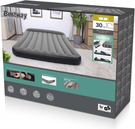 Dwuosobowy materac nadmuchiwany BESTWAY o wymiarach 203 × 152 × 30 cm jest idealny na kemping oraz jako wygodne, tymczasowe łóżko dla gości. Ma wytrzymałe PVC, na powierzchni przyjemny welur, a dla maksymalnego komfortu zintegrowaną poduszkę. Za szybkie użytkowanie odpowiada wbudowana elektryczna pompa AC do łatwego pompowania i spuszczania powietrza. Świetne połączenie wygody, trwałości i szybkiego przygotowania do snu.