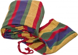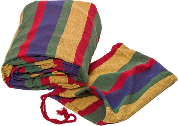 W zestawie znajduje się materiałowe etui w tych samych kolorach. Hamak zajmuje minimum miejsca i łatwo go zabrać ze sobą.