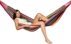 Ciesz się relaksem na zewnątrz w kolorowym hamaku z wytrzymałej bawełny z domieszką poliestru. Łatwo zawiesisz go między drzewami lub na tarasie, a dzięki etui bez trudu zabierzesz wszędzie. Oddychający materiał zapewnia przyjemny komfort, poszewka prana w pralce ułatwia pielęgnację, a udźwig 120 kg gwarantuje niezawodne podparcie.