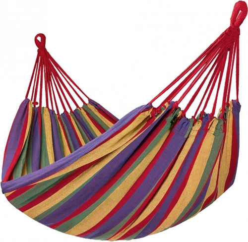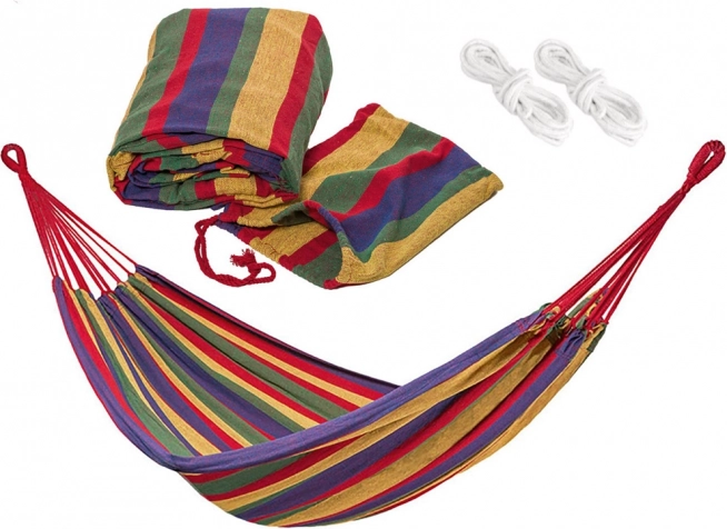 Ten wygodny hamak z wesołym pasiastym wzorem jest idealny do ogrodu, na balkon i do wnętrz. Wystarczy przywiązać oba końce do solidnych punktów – drzew, haków lub słupków – i możesz kołysać się oraz relaksować na świeżym powietrzu.