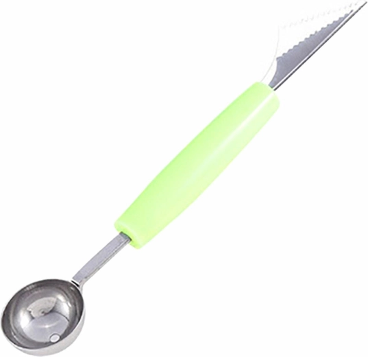 Praktyczny dwustronny dekoracyjny nóż do owoców. Ta wykrawaczka jest wyposażona w długą ergonomiczną rączkę oraz dwa solidne ostrza ze stali nierdzewnej. Ząbkowany czubek umożliwia wycinanie efektownych wzorów, natomiast okrągłe zakończenie jest idealne do tworzenia kulek z owoców lub porcji lodów.