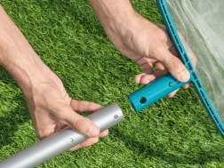 Siatkę można szybko zamocować do standardowych teleskopowych tyczek o średnicy 30 mm, co zapewnia wygodny zasięg na całej powierzchni basenu.