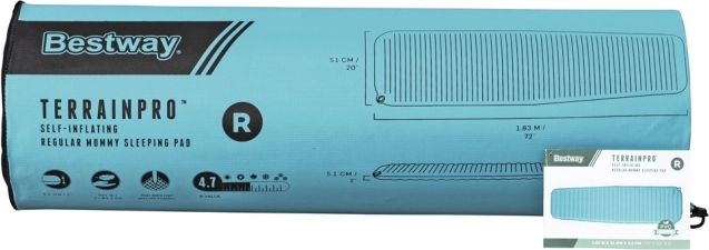 Mata samopompująca BESTWAY TerrainPro zapewnia maksymalny komfort i izolację termiczną podczas biwaków i wędrówek. Dzięki wymiarom 183 × 51 × 5,1 cm oraz współczynnikowi R 4,7 utrzymuje ciepło nawet w chłodnej pogodzie. Trwały materiał ToughLite i nylon ripstop 70D gwarantują długą żywotność, a niskoprofilowy zawór przyspiesza pompowanie i spuszczanie powietrza. Przy masie zaledwie 924 g i kompaktowych wymiarach 15 × 54 cm łatwo mieści się w plecaku; w zestawie znajduje się także worek transportowy i łatka naprawcza.