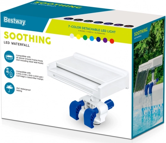 Ożyw swój basen dzięki wodospadowi Bestway Flowclear z oświetleniem LED, który sprawi radość dzieciom i zapewni relaks dorosłym podczas kąpieli w domowym basenie. Ten łatwy w użyciu wodospad można zamontować we wszystkich modelach basenów ze stelażem oraz pompą filtrującą o wydajności od 2006 do 11 355 l/h.