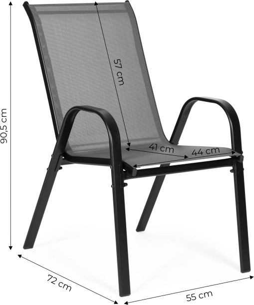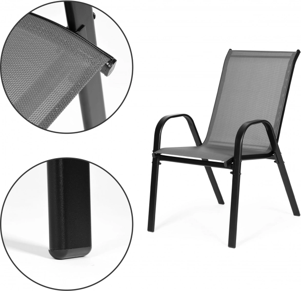Tekstylna siatka tworząca siedzisko i oparcie jest wodoodporna i szybko schnąca, więc łatwo opiera się deszczowi i porannemu roszeniu. Nogi z antypoślizgowymi końcówkami chronią powierzchnię podłogi przed zarysowaniami i zapewniają stabilność podczas siedzenia. Dzięki możliwości układania oszczędza miejsce przy przechowywaniu w czasie, gdy nie są używane.
