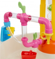 Połączone kolorowe rurki z zaworami i młynkami wodnymi pozwalają zmieniać kierunek i prędkość strumienia oraz obserwować różne efekty.