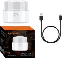 Kompaktowa lampa kempingowa SUPERFIRE T20 oferuje strumień świetlny 180 lm, do 10 godzin pracy oraz 4 tryby świecenia, w tym SOS i stroboskop. Dzięki ładowaniu przez micro USB, niskiej masie i praktycznemu haczykowi jest idealna do namiotu, garażu i domu.