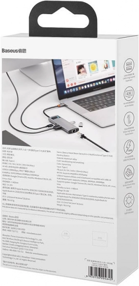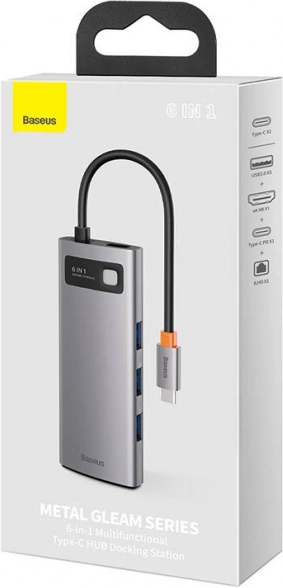 Hub USB‑C 6w1 Baseus Metal Gleam z HDMI, 3× USB 3.0, PD i gigabitowym Ethernetem
