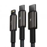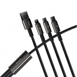 Szukasz jednego kabla do wszystkich swoich urządzeń? Baseus Tungsten Gold 3 w 1 łączy złącza Lightning, USB‑C i micro USB, dzięki czemu łatwo naładujesz iPhone’a, nowoczesne smartfony z Androidem, starsze urządzenia oraz drobną elektronikę. Obsługa prądu do 3,5 A i mocy do 66 W zapewnia szybkie uzupełnianie energii, a gałąź Lightning oferuje transfer danych 480 Mb/s.