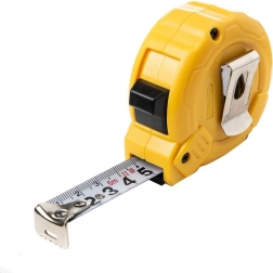 Ergonomiczna obudowa z wytrzymałego tworzywa ABS dobrze leży w dłoni i jest odporna na uderzenia oraz codzienne zużycie. Praktyczny metalowy klips umożliwia przypięcie do paska, a pętla ułatwia przenoszenie lub zawieszenie w warsztacie. Haczyk pomiarowy na końcu taśmy wspiera dokładne pomiary wewnętrzne i zewnętrzne.