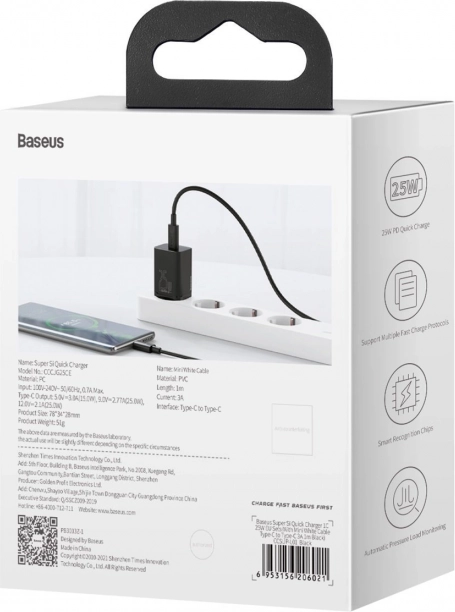 Ta ładowarka Baseus jest nie tylko wydajna, lecz także bezpieczna dzięki obudowie z ABS, która zapewnia efektywne odprowadzanie ciepła. W zestawie znajduje się również wytrzymały kabel USB-C do USB-C wykonany z materiału TPE dla długiej żywotności.