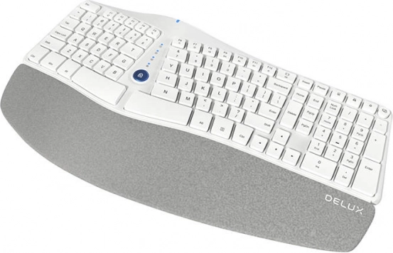 Ciesz się maksymalnym komfortem pisania z bezprzewodową ergonomiczną klawiaturą DELUX GM901D. Oferuje zakrzywiony kształt dla naturalnego ułożenia dłoni, zintegrowaną podpórkę nadgarstków z przyjemnego materiału, łączność nawet z 3 urządzeniami przez Bluetooth 3.0/5.0 i 2,4 GHz, ciche i wytrzymałe klawisze oraz praktyczne skróty funkcyjne do multimediów i głośności.
