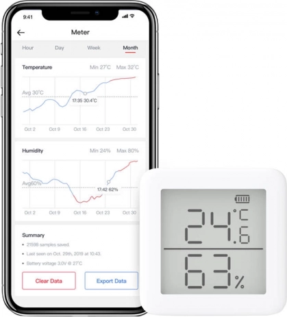 Połącz urządzenie przez Bluetooth z aplikacją SwitchBot, śledź historię do 5 tygodni (lub bez ograniczeń w chmurze z hubem), eksportuj dane do CSV i otrzymuj inteligentne alerty.