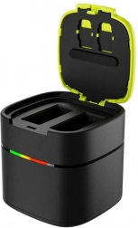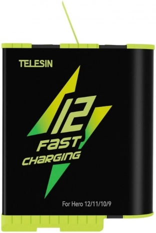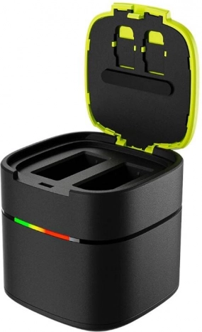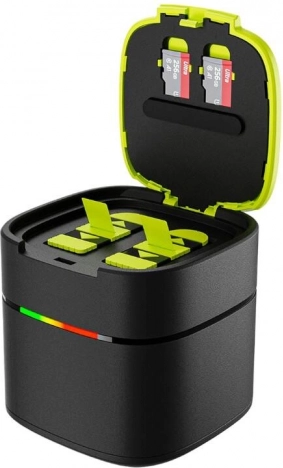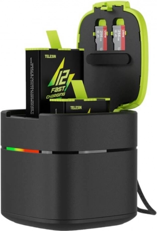Box pełni jednocześnie funkcję etui transportowego i magazynującego – wewnątrz znajdują się gniazda na 2 akumulatory i 2 karty pamięci. Jest kompatybilny z akumulatorami TELESIN, oryginalnymi akumulatorami GoPro oraz wybranymi zamiennikami innych producentów.