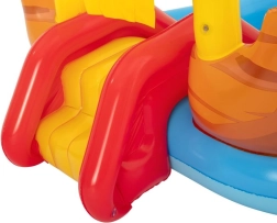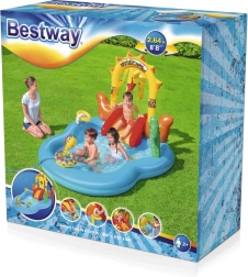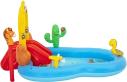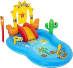 Wykorzystaj lato w pełni z tematycznym wodnym centrum Bestway Wild West. Kolorowy design, bezpieczna konstrukcja i pomysłowe dodatki gwarantują godziny aktywnej zabawy na świeżym powietrzu. Zintegrowany zraszacz podłączysz bezpośrednio do węża ogrodowego, a o wygodne ślizganie zadba dmuchana poduszka w podłodze.