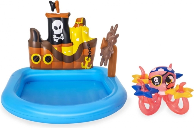 Zamień ogród w małe wodne królestwo. Ten nadmuchiwany piracki plac zabaw BESTWAY oferuje niebieski basenik z dekoracją statku, obrotowym kołem sterowym, rzucanymi kółkami/gwiazdami i wesołą ośmiornicą. Wykonany z wytrzymałego PVC, łatwy w rozstawieniu i idealny do bezpiecznej wodnej zabawy dla najmłodszych.