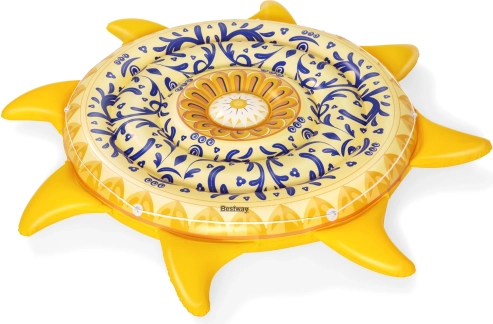 Ciesz się latem w wielkim stylu z dmuchanym leżakiem w kształcie słońca. Kolorowe wzory na leżaku inspirowane są tradycyjną sztuką śródziemnomorską i sycylijską. Łatwe pompowanie, spuszczanie powietrza i składanie.