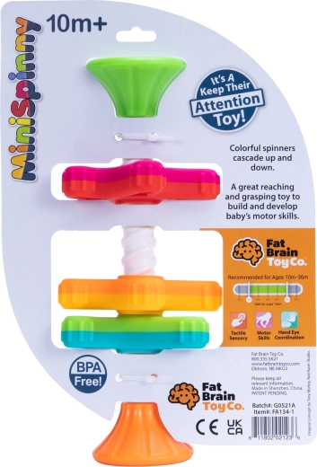 MiniSpinny to sprytna zabawka sensoryczna, która angażuje dzieci ruchem, kolorami i dotykiem. Trzy krążki z różną liczbą „nóżek” gładko przesuwają się po spiralnym pręcie, tworząc fascynujący efekt wizualny podczas zjazdu. Teksturowane powierzchnie zachęcają do eksploracji i naturalnie rozwijają zmysł dotyku oraz koordynację.