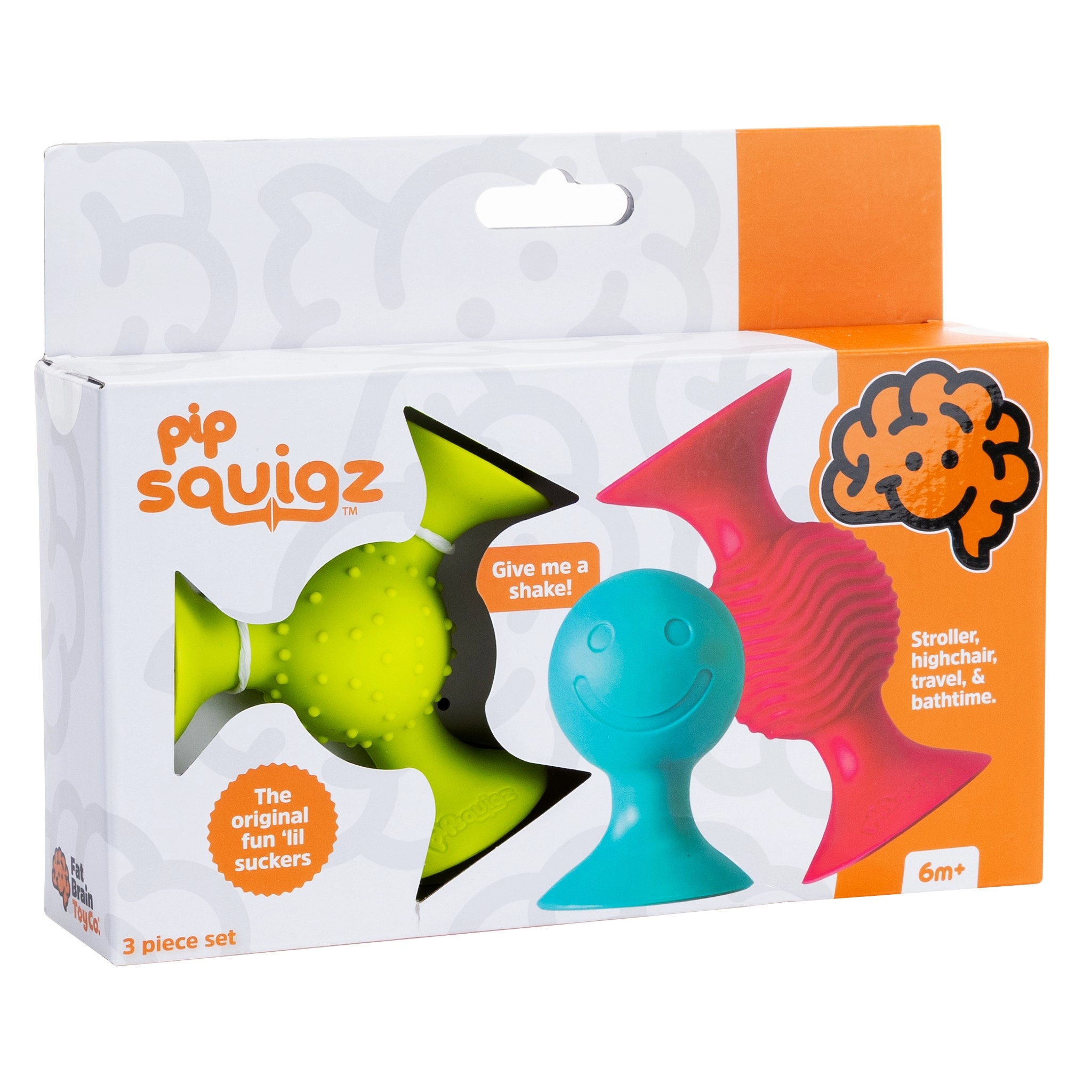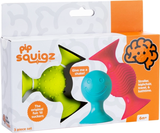 Zestaw pipSquigz (3 szt.) zapewnia dzieciom nieskończone możliwości zabawy w domu i w podróży. Każdy element wykonano z wysokiej jakości, miękkiego silikonu i wyposażono w przyssawki, które pewnie trzymają się gładkich powierzchni – na krzesełku do karmienia, w wannie i na oknie. Grzechoczące i fakturowane elementy zachęcają do chwytania i ugniatania, w naturalny sposób rozwijając motorykę i zmysły.