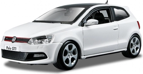 Metalowy kolekcjonerski model samochodu VW Polo GTI Mk5 w skali 1:24 marki BBURAGO. Precyzyjne wykonanie nadwozia z plastikowymi detalami, idealny do gabloty i na prezent. Dostarczany losowo w kolorze czerwonym lub białym.