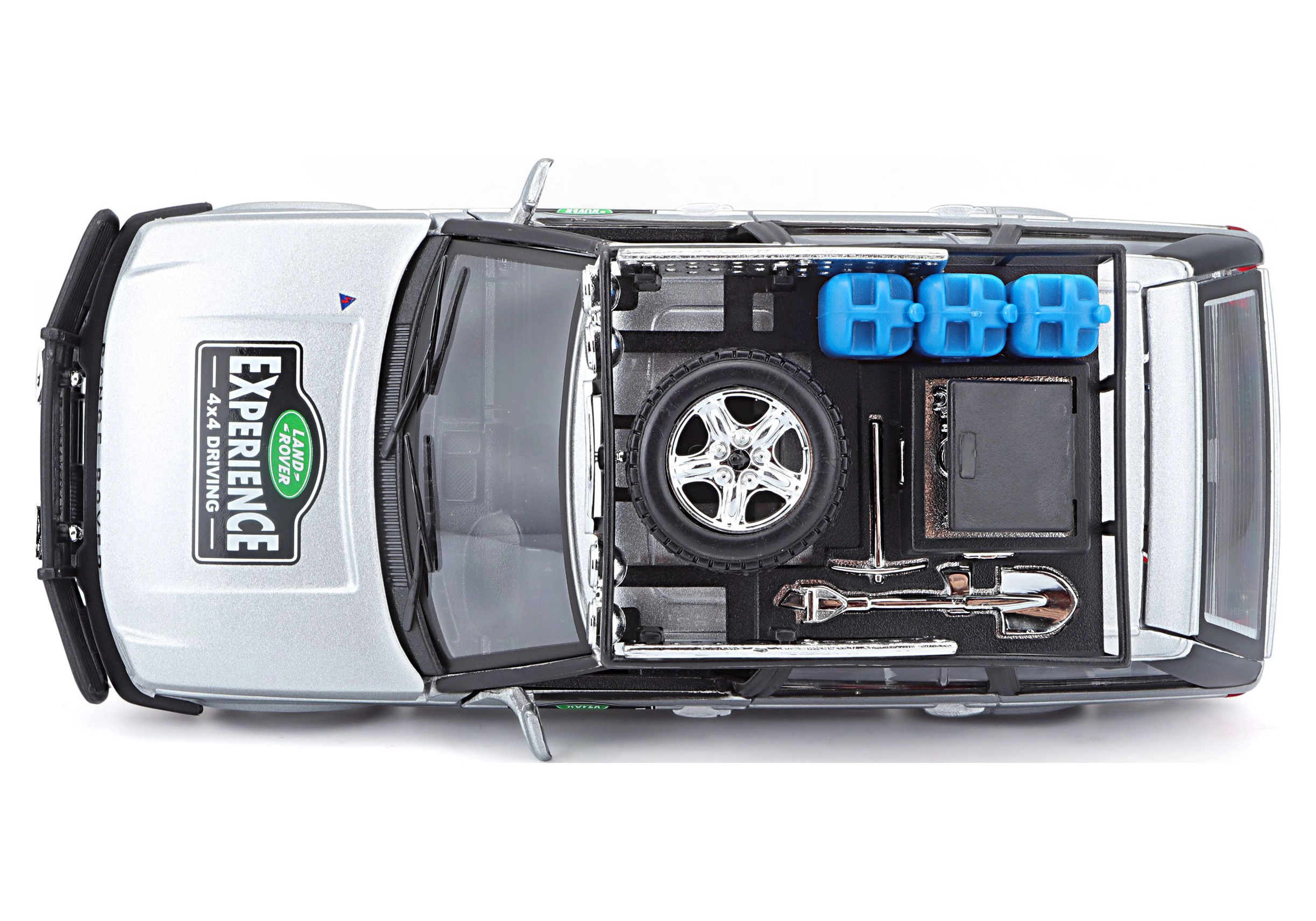 Model zdobi bagażnik dachowy z akcesoriami – kanistry, koło zapasowe, narzędzia i dodatkowe światła nadają przygodowy charakter.