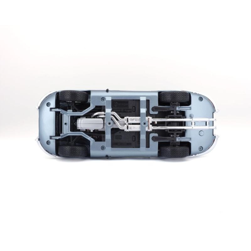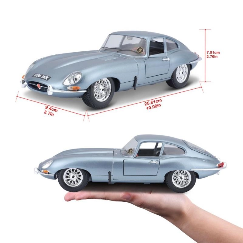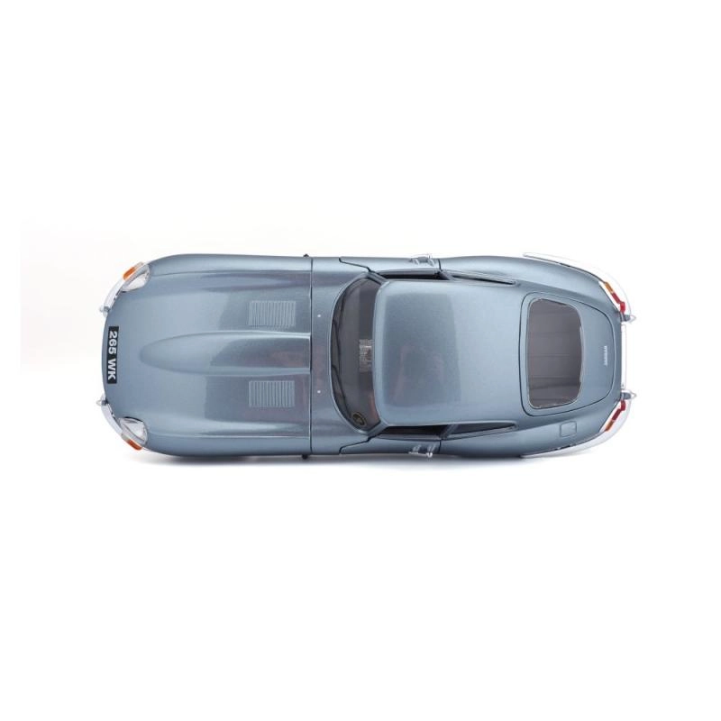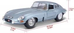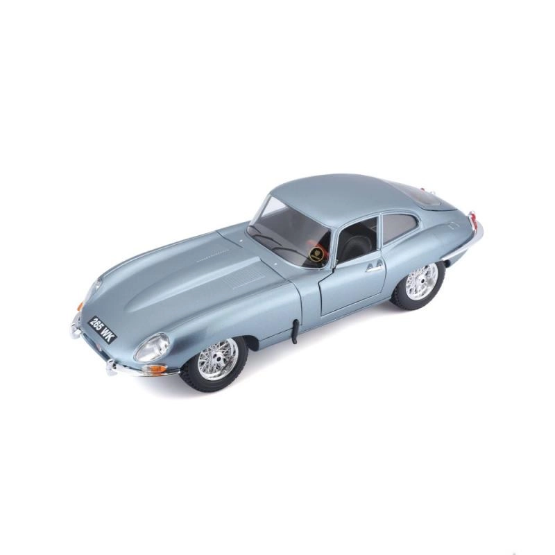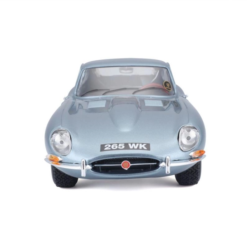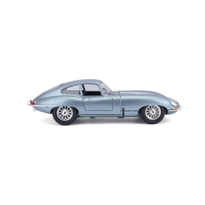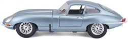 Metalowy model auta w skali 1:18 Bburago 18-12044 Jaguar E-type Coupe nie tylko dla kolekcjonerów. Ma otwierane drzwi i maskę, a skręt kół kierownicą jest w pełni funkcjonalny. Kolor modelu to srebrno-niebieski metalik.