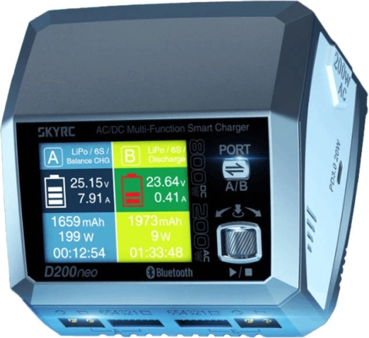 SKYRC D200neo to profesjonalna, dwukanałowa ładowarka do akumulatorów RC i do warsztatu, która przyspieszy Twoją pracę i ułatwi zarządzanie pakietami. Dzięki inteligentnemu sterowaniu prądem i mocą obsługuje ładowanie równoległe dwóch pakietów z wyjątkową stabilnością i precyzją. Zintegrowany kolorowy wyświetlacz z interfejsem ColorX wyraźnie ułatwia obsługę i kontrolę stanu.