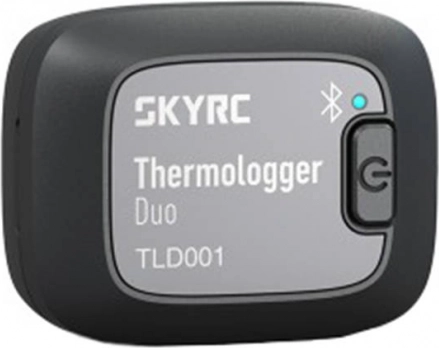 SkyRC Thermologger Duo: dwukanałowy Bluetoothowy rejestrator temperatury do RC. Zakres -20 do 210 °C, dokładność ±2 °C, BLE 5.0, czas pracy do 96 h.