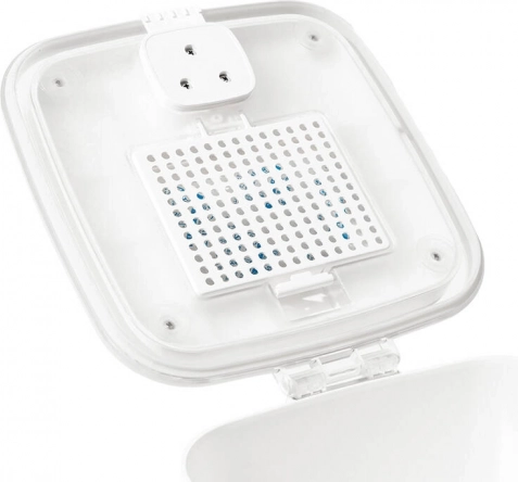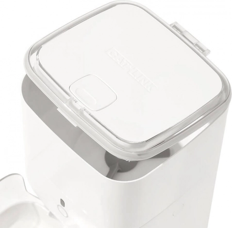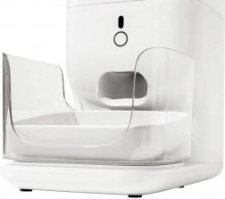 Zaawansowany system uszczelniania, automatyczne zamykanie zsypu oraz pojemnik z pochłaniaczem wilgoci utrzymują chrupki świeże i chrupiące, a konstrukcja zapobiega zatorom (granulki do 16 mm). Miska z ergonomicznym nachyleniem 7° jest wygodna podczas jedzenia, a wszystkie części łatwo się czyści. Zasilanie zapewnia zasilacz lub 4× baterie AA dla spokoju także podczas awarii prądu.