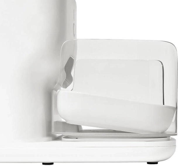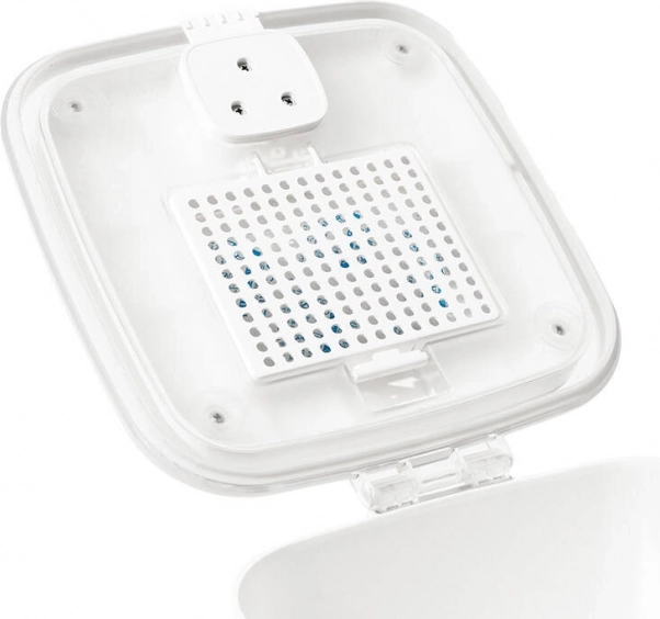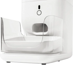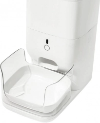 Dla maksymalnej świeżości łączy uszczelniające elementy silikonowe, automatyczne zamykanie wylotu oraz pochłaniacz wilgoci. Konstrukcja zapobiega zapychaniu granulek do 16 mm, a miska o nachyleniu 7° ułatwia pobieranie pokarmu. Podajnik można zasilać z sieci oraz 4× bateriami AA, a offline podawanie działa podczas przerwy w dostawie prądu lub internetu.
