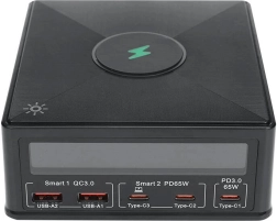 Zintegrowana bezprzewodowa podkładka 15 W dodaje wygody bez kabli. Wyświetlacz LCD zwiększa przejrzystość postępów ładowania, a elementy antypoślizgowe i kontrola temperatury podnoszą bezpieczeństwo. Wysokiej jakości konstrukcja z PC+ABS sprawdzi się w domu i biurze, a szeroki zakres wejściowy AC 100–240 V jest idealny w podróży.
