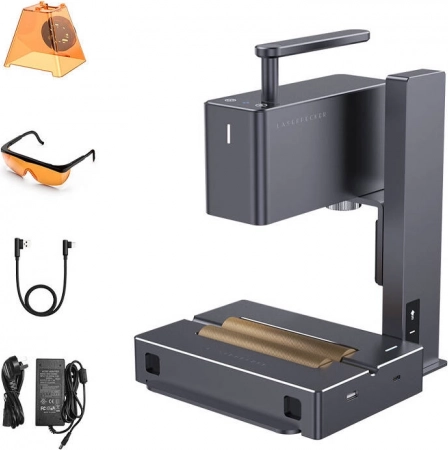 Zawartość zestawu: jednostka laserowa, przewód zasilający z adapterem, elektryczny statyw, uniwersalny elektryczny walec LaserPecker, osłona lasera, 2× kabel USB, okulary ochronne, linijka, klucze i śruby.