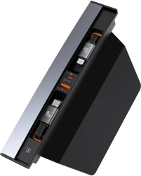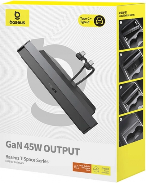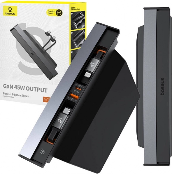 Baseus T-Space to elegancki i funkcjonalny rozdzielacz zaprojektowany pod kątem wnętrza samochodów Tesla. Umożliwia wygodne ładowanie nawet czterech urządzeń jednocześnie – dwa wysuwane przewody USB‑C (0,8 m) dla pasażerów z przodu i z tyłu uzupełniają złącza USB‑C i USB‑A. Dzięki technologii GaN i mocy do 45 W otrzymasz szybkie i stabilne ładowanie bez przegrzewania.