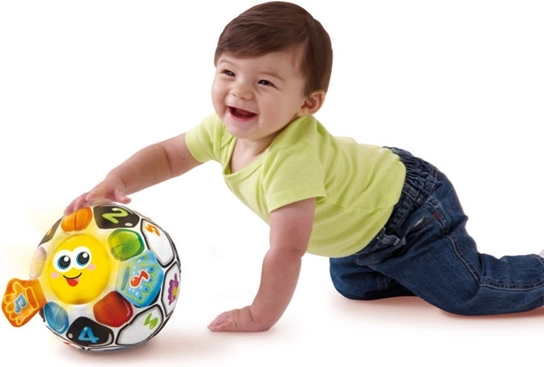 Dzięki swoim zdolnościom piłeczka potrafi toczyć się przed dziećmi, co przyciąga ich uwagę i motywuje do obserwacji, pełzania i zabawy. Ta kolorowa piłka o różnych fakturach i efektach dźwiękowych nie tylko rozwija zmysłową percepcję, ale także zapewnia dotykową stymulację dzięki delikatnej pluszowej powłoce. Efekty świetlne i dźwiękowe wzbogacone świecącym buziakiem i pomarańczowymi przyciskami pomagają w poznawaniu kolorów.
