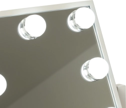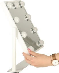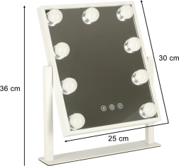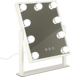 Eleganckie kosmetyczne lustro w stylu Hollywood z 9 żarówkami LED zapewnia równomierne i naturalne oświetlenie dla nieskazitelnego makijażu. Panel dotykowy umożliwia zmianę temperatury barwowej (zimna/ciepła/neutralna) oraz płynne ściemnianie. Stabilna metalowa konstrukcja, zasilanie USB i praktyczny wymiar 25 × 30 cm czynią z lustra stylowy i funkcjonalny dodatek do każdej toaletki.