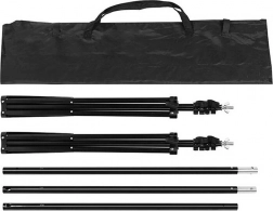 Zestaw zawiera dwa statywy podporowe, trzy poprzeczki oraz belkę nośną. Wszystko dostarczane jest z praktyczną torbą do wygodnego transportu.