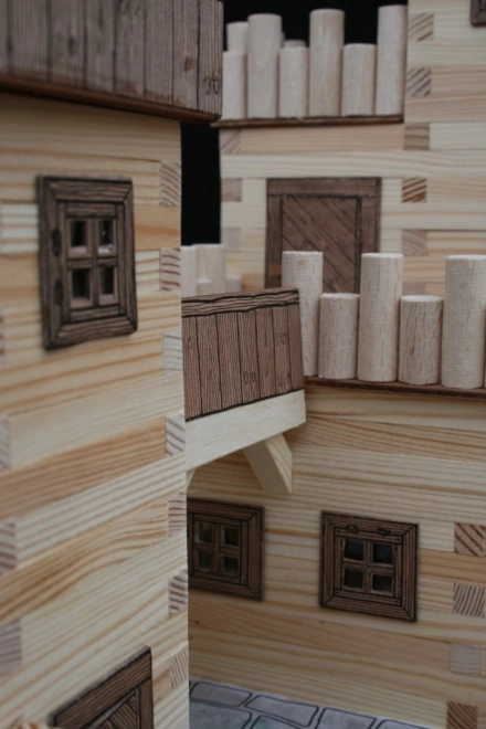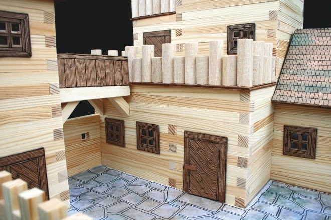 Drewniane listwy 9×9 mm oraz papierowe dodatki (okna, drzwi, dachy) zapewniają wierny wygląd średniowiecznej architektury.