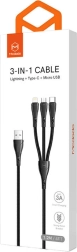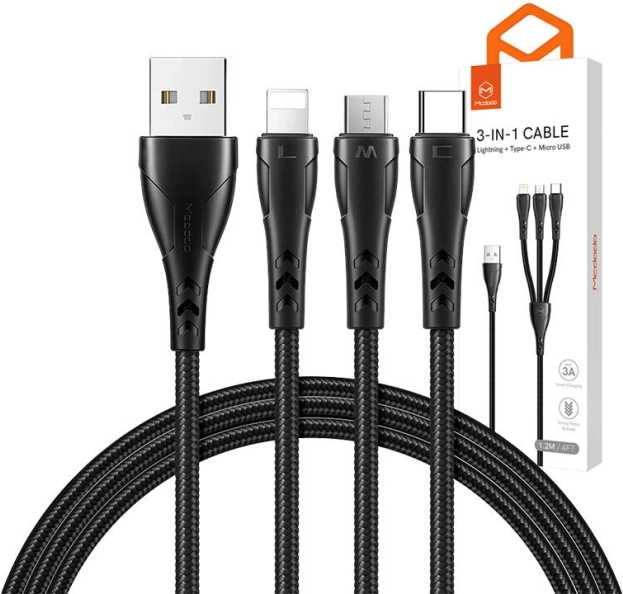 Jeden kabel, trzy złącza – dzięki USB‑C, Lightning i Micro USB obsłużysz większość nowoczesnych urządzeń: smartfony, tablety, słuchawki bezprzewodowe czy powerbanki. Kabel potrafi zasilać do trzech urządzeń naraz, oszczędzając miejsce i czas.