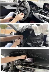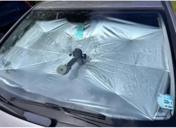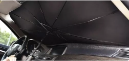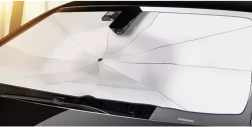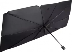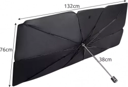 Osłona rozkłada się jak parasol i łatwo mocuje się na wewnętrznej stronie przedniej szyby. Specjalna srebrna powłoka odbija promienie słoneczne, co utrzymuje wnętrze samochodu w chłodzie.