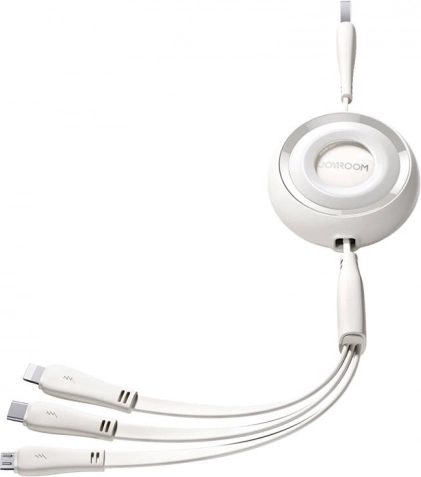 Uniwersalny kabel Joyroom 3w1 z końcówkami USB‑C, Lightning i Micro USB zapewnia szybkie i bezpieczne ładowanie do 3,5 A, ma długość 1 m oraz zwijaną konstrukcję dla wygodnego przechowywania. Wytrzymałe wykonanie z PC+TPE gwarantuje długą żywotność i porządek bez splątanych przewodów.