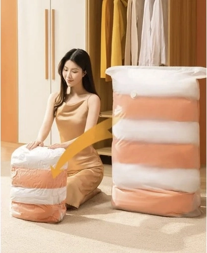 Skompresuj obszerne tekstylia w kilka chwil. Po odessaniu powietrza objętość znacznie się zmniejsza, a w szafie lub walizce zyskujesz dodatkowe miejsce.