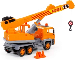 Seria specjalnych maszyn „Diament” z napędem zamachowym od producenta Polesie obejmuje główne typy pojazdów używanych w prawdziwym życiu przy różnych pracach. Samochody mają realistyczny wygląd z dbałością o detale: znajdują się tu imitacje reflektorów, migających świateł oraz trzy pary kół na metalowych osiach. Samochód‑żuraw jest wyposażony w obrotową platformę i wysuwny wysięgnik z zawieszonym hakiem. Hak można podnosić i opuszczać za pomocą mechanizmu ręcznego. Zabawka zawiera także pachołki budowlane, które urozmaicą i dopełnią zabawę.