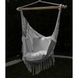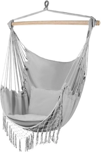 Drewniany drążek rozporowy równomiernie rozprowadza obciążenie, dzięki czemu fotel jest dobrze wyważony i stabilny. Mocna lina zawieszenia z pierścieniem montażowym umożliwia łatwe zawieszenie i bezpieczne użytkowanie. W zestawie znajdują się 2 poduszki 40 × 40 cm, które zwiększają komfort siedzenia.