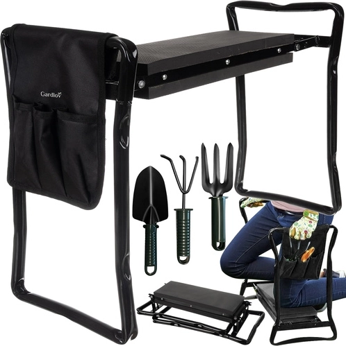 W komplecie otrzymujesz pełny zestaw do drobnych prac: łopatkę, kultywator („pazury”) i ogrodowe widełki. Łatwo przełączysz się między trybem klęczenia a siedzenia w zależności od wykonywanej czynności, odciążając plecy i kolana.